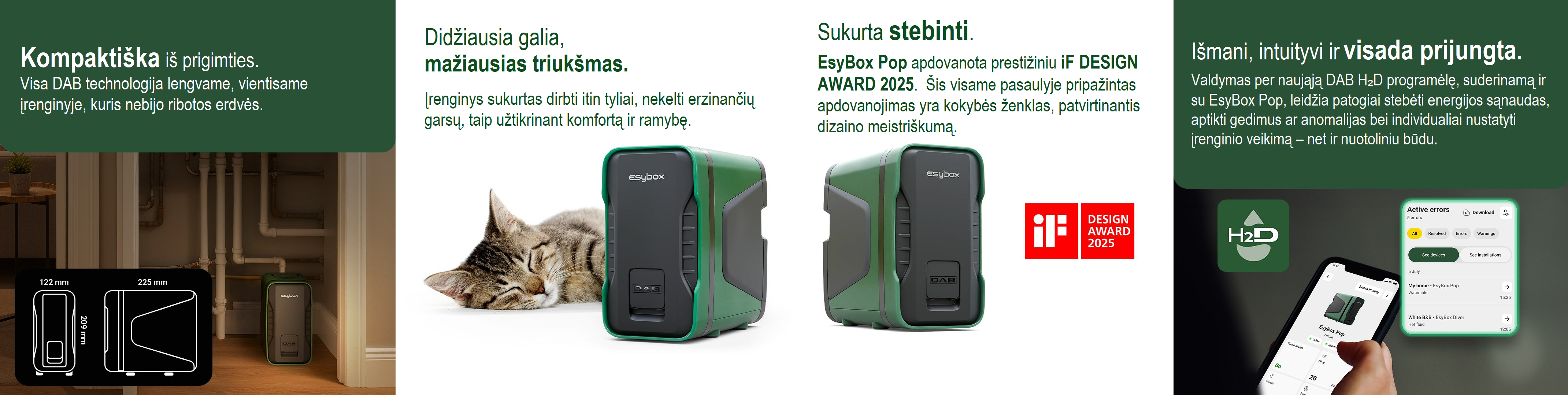 Išmanus valdymas – su DAB H₂D programėle galima stebėti energijos sąnaudas, atlikti diagnostiką, aptikti gedimus ir konfigūruoti įrenginį nuotoliniu būdu.