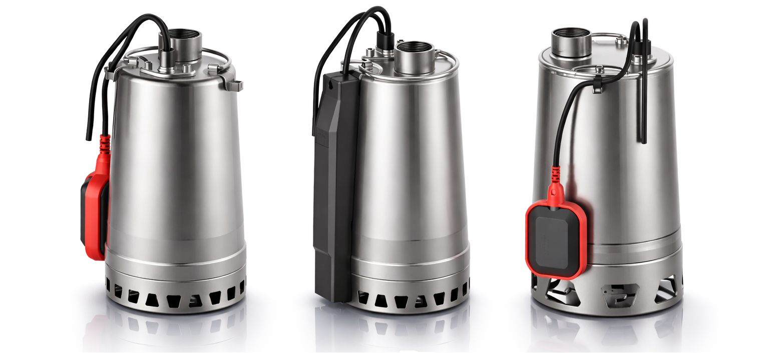 📌 Galimi modeliai su plūdiniu jungikliu (SA) arba su talpiniu davikliu (SE), leidžiančiu automatizuoti siurblio veikimą.