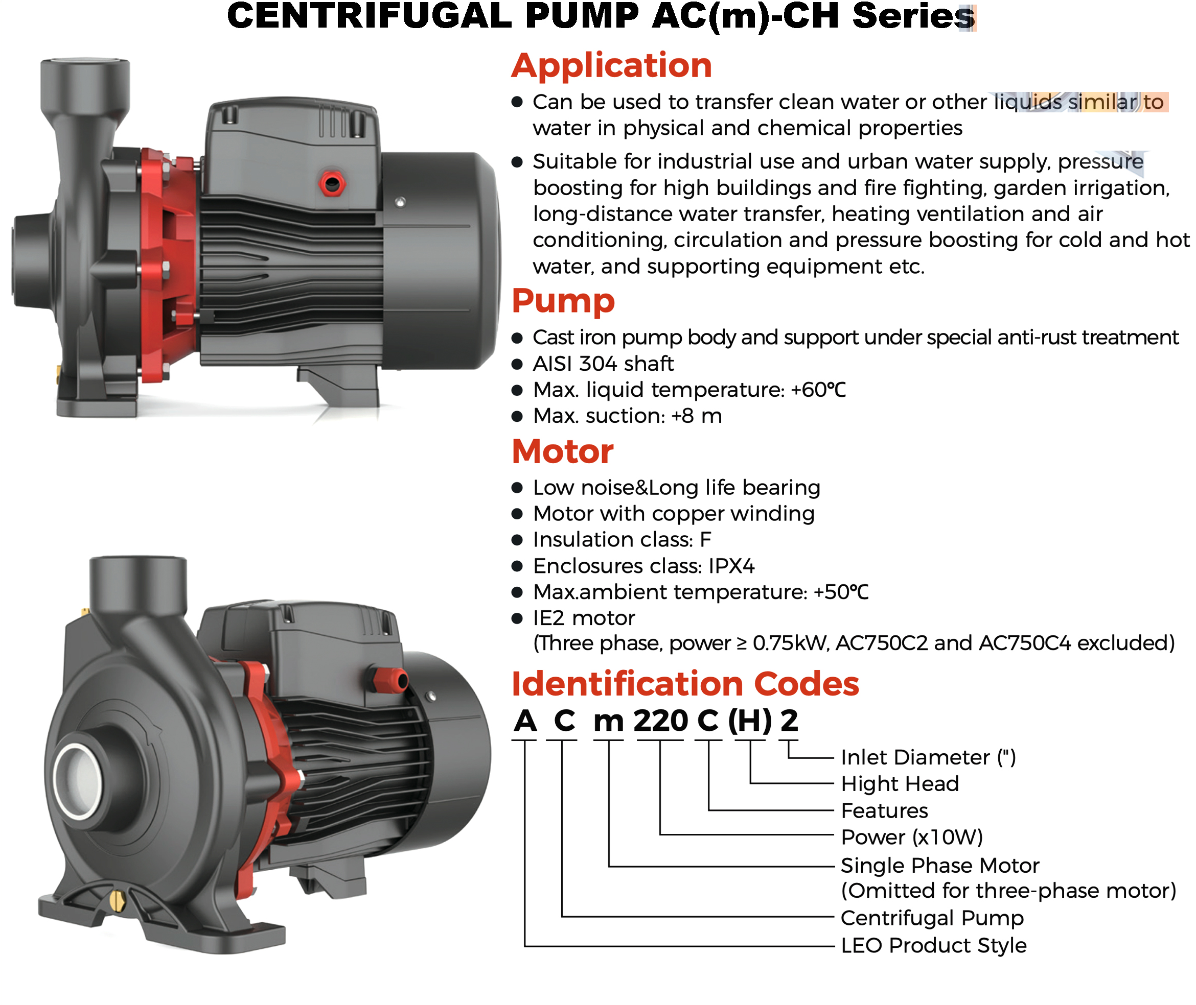 LEO ACmC2 išcentrinių sausai statomų siurblių korpusas pagamintas iš kokybiško ketaus, padengtas specialia antikorozine danga, o darbaratis – iš žalvario, todėl produktas pasižymi atsparumu korozijai ir patvarumu. Siurbliai pritaikyti naudojimui pramonėje, priešgaisrinėse, oro kondicionavimo bei centralizuotose šildymo cirkuliacijos sistemose, vandens slėgio kėlimui, vandens tiekimui, sodo/šiltnamio laistymui bei kitoms žuvininkystės ir žemės ūkio reikmėms. LEO ACmC2 siurbliai tinkami pumpuoti chemiškai neagresyvų siurblio dalims, švarų vandenį.