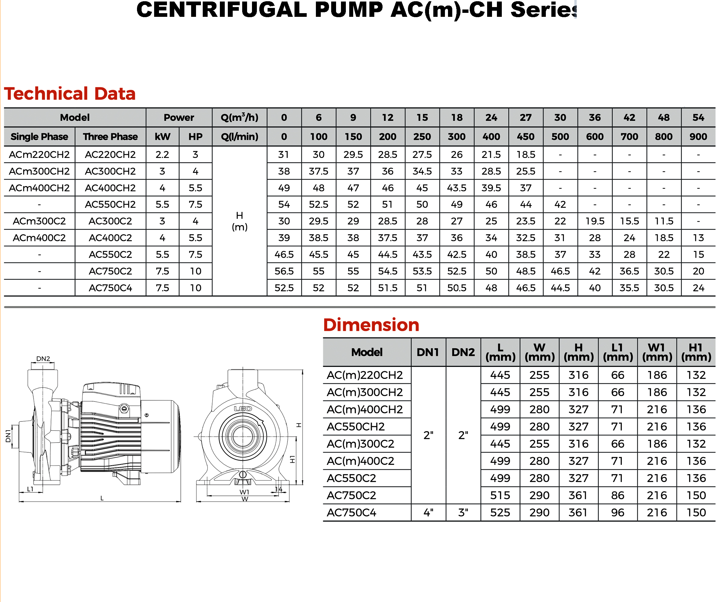 LEO ACmC2 išcentriniai siurbliai orientuoti į energinį efektyvumą ir yra itin paprastai naudojami. Šių sausai statomų vandens siurblių variklis yra visiškai uždaras, aušinamas ventiliatoriumi. LEO ACmC2 išcentrinių siurblių veikimo maksimali aplinkos temperatūra gali siekti +50° C, o siurbiamo skysčio temperatūra +60° C. LEO AC400C2 serijos vandens siurblių įsiurbimo lygis – iki 8 m, o maksimalus kėlimo aukštis siekia 39 m, todėl įrenginys idealiai tinka įvairiems vandens pumpavimo darbams.