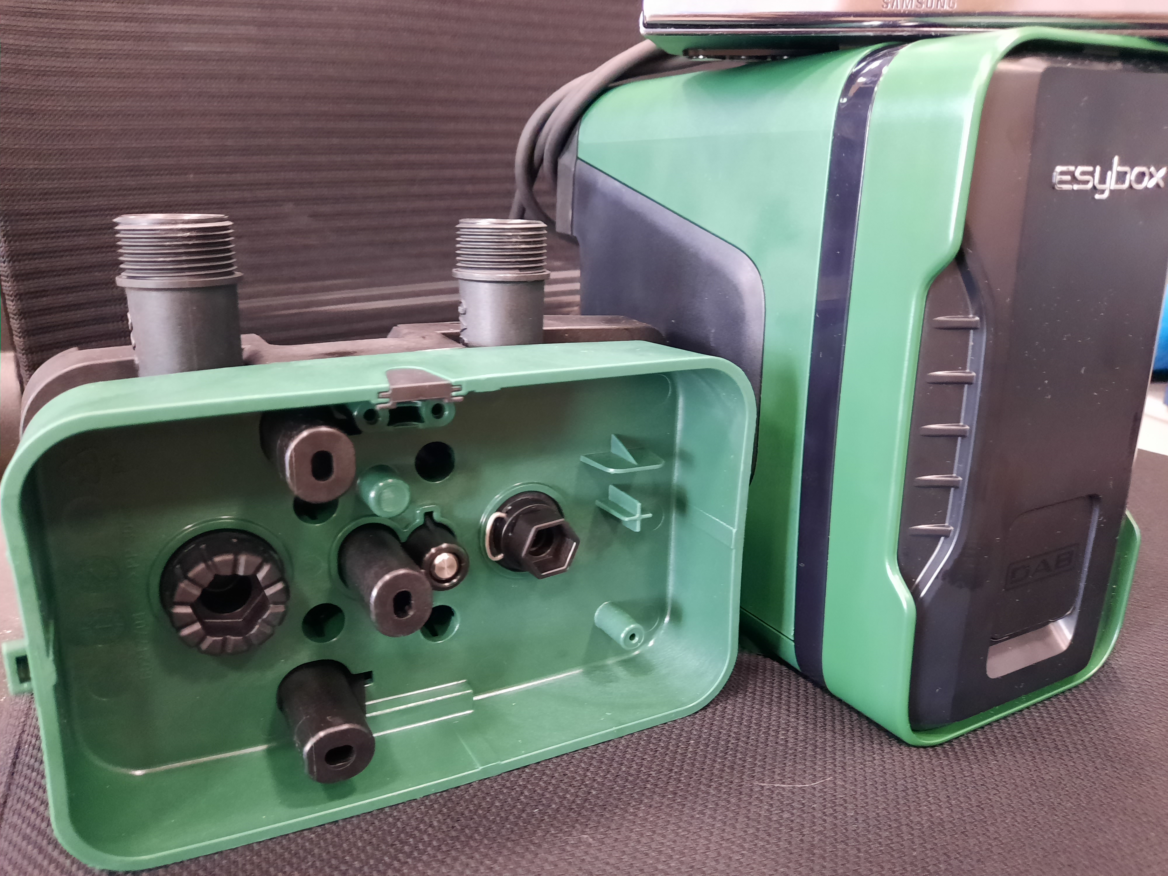 - ESYDOCK POP (įsigyjama papildomai): reguliuojamos jungtys, pritaikytos įvairioms vamzdyno konfigūracijoms; komplekte yra montavimo laikikliai, jungtys. Taip pat yra DW versija su antriniu integruotu slėgio jutikliu — tai leidžia tiesiogiai prijungti įrenginį prie esamo buitinio vandentiekio, kur tai leidžiama.
