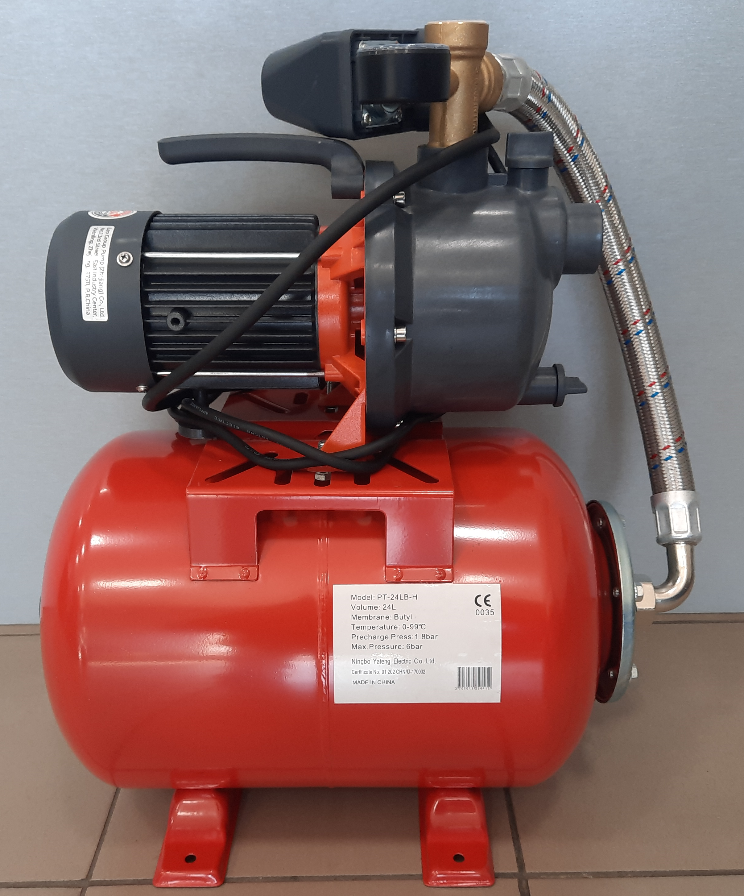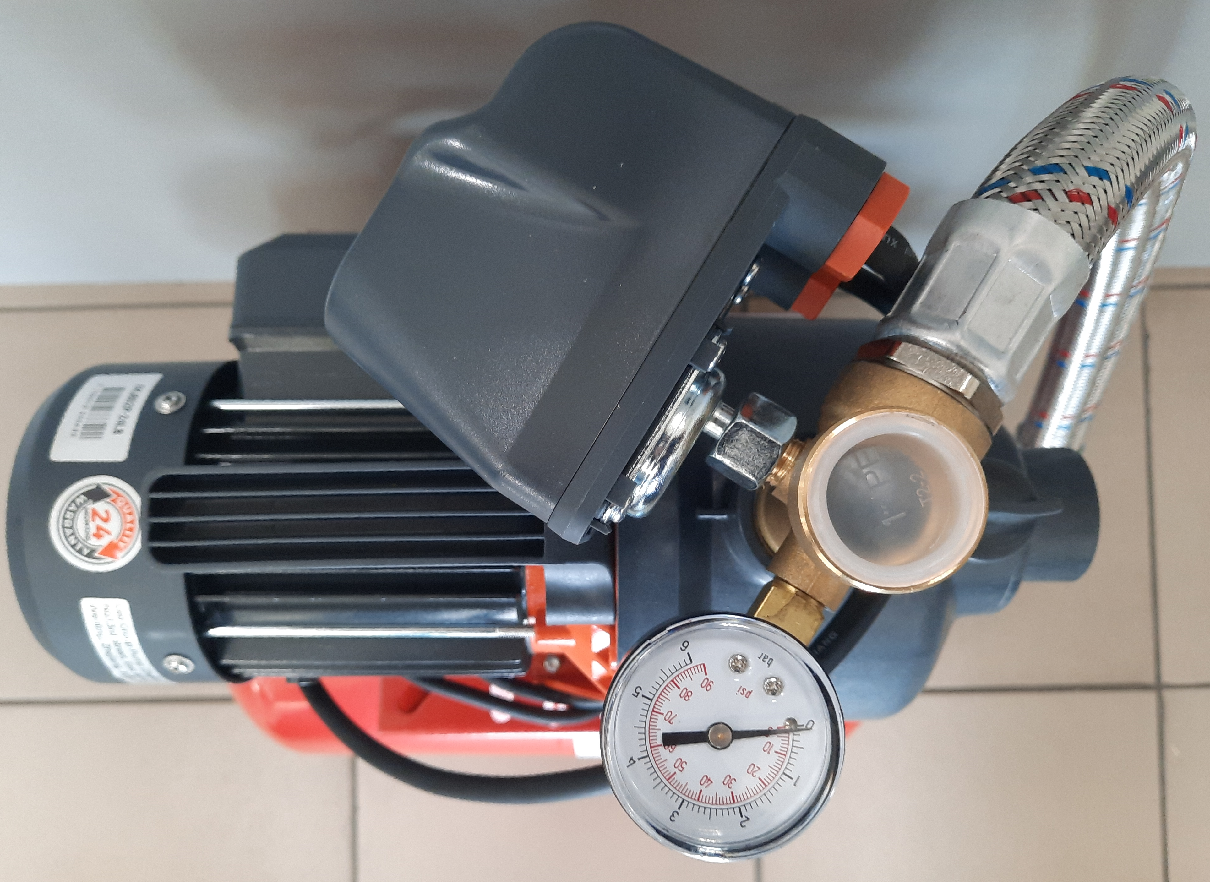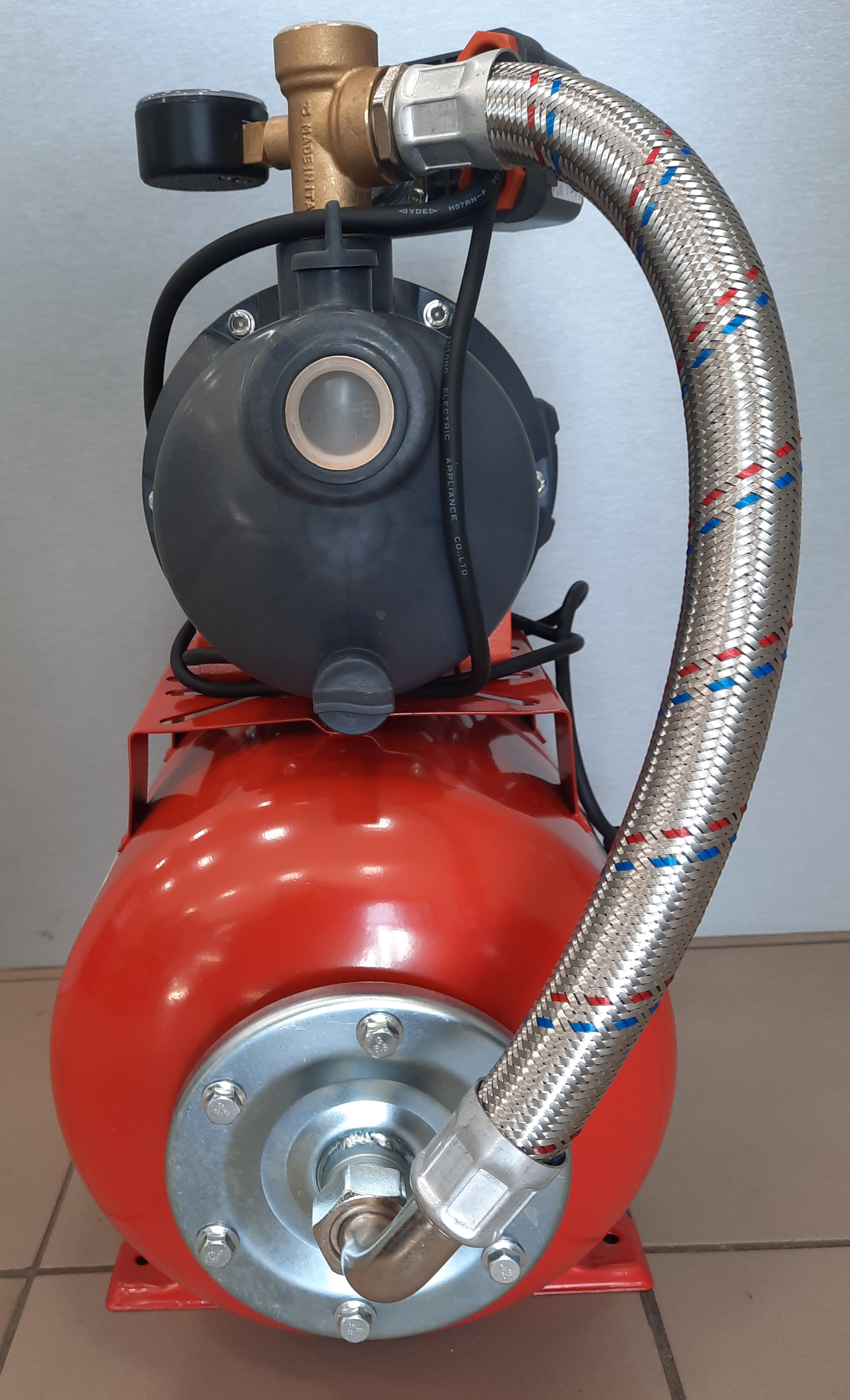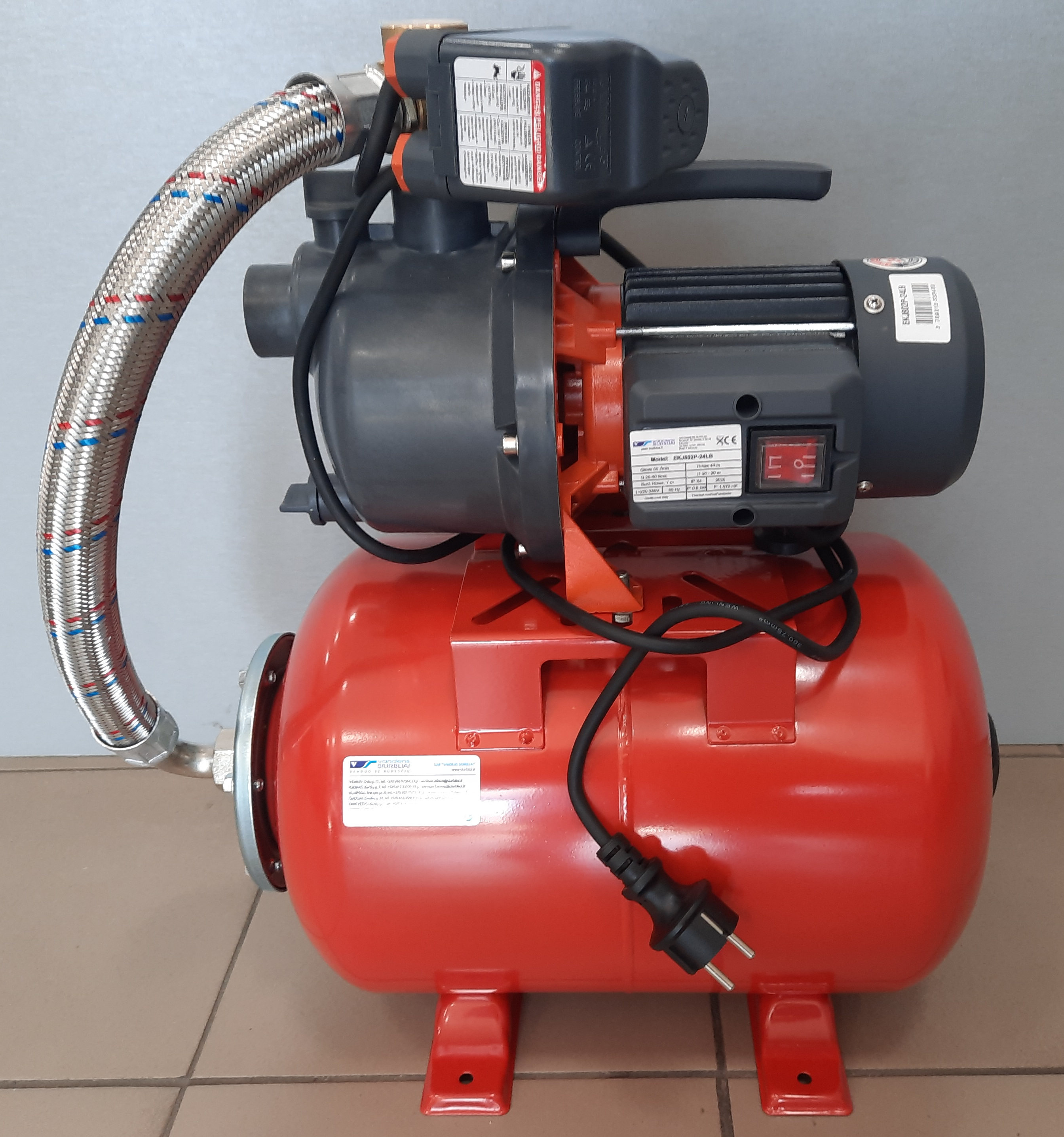 Automatinė vandens tiekimo sistema su mechaniniu valdymu, skirta buitiniam švaraus vandens tiekimui. Sistema veikia naudojant slėgio relę ir hidroforą: pradėjus vartoti vandenį, slėgis bake sumažėja, o slėgio relė automatiškai įjungia siurblį. Pasiekus nustatytą slėgį, siurblys automatiškai išjungiamas. Komplektas, sudarytas iš 24 litrų plėtimosi indo, slėgio relės automatiniam veikimui, manometro, savaime įsiurbiančio elektros siurblio su maitinimo kabeliu ir kištuku. Visi komponentai yra surinkti, išbandyti ir paruošti montavimui.