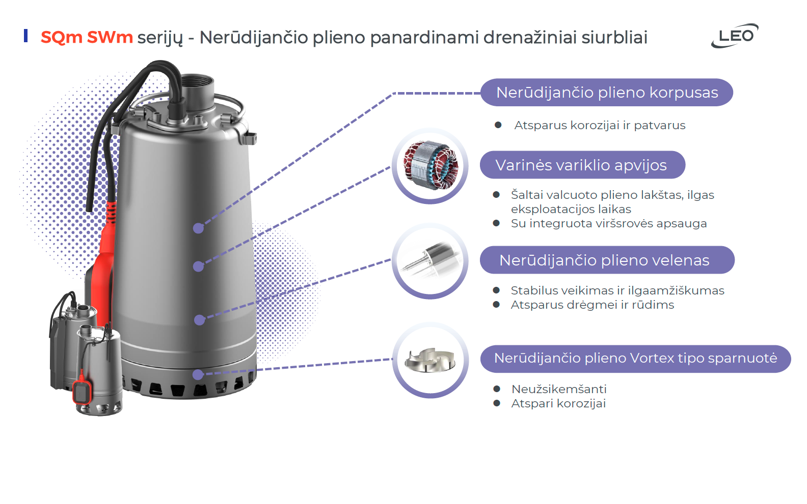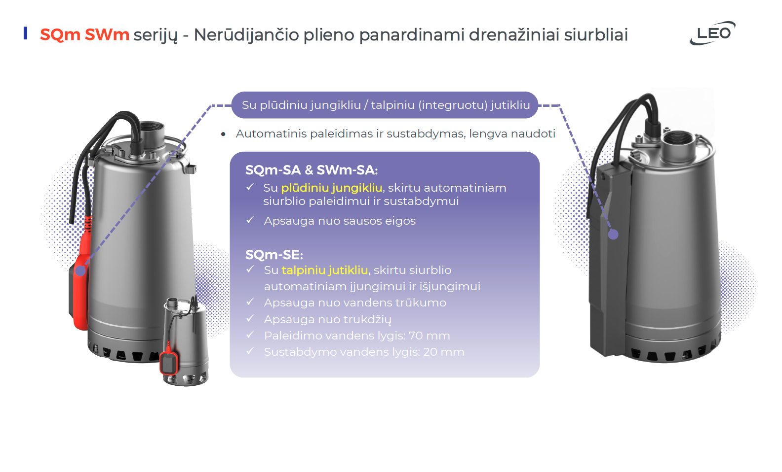 SQm serijos panardinami siurbliai sukonstruoti iš aukštos kokybės nerūdijančio plieno, skirti vandens tiekimui iš šulinių, upių ar rezervuarų. Tinka tiek buitinėms, tiek profesionalioms reikmėms, ypač ten, kur reikalingas patikimas, automatinis siurbimas.