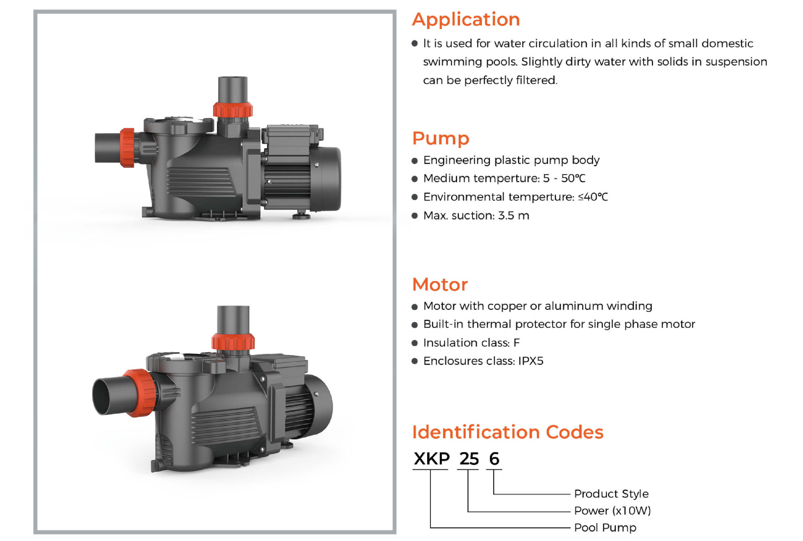 LEO XKP baseinų siurblių apsauga nuo perkaitimo garantuoja saugų funkcionavimą, o saugi ir patikima variklio struktūra užtikrina, kad vanduo nepatektų į vidų. Šie siurbliai orientuoti į energinį efektyvumą ir yra itin paprastai naudojami. LEO XKP siurblių veikimo maksimali aplinkos temperatūra gali siekti 40 °C, o siurbiamo skysčio temperatūra gali svyruoti nuo 5 iki 50 °C.